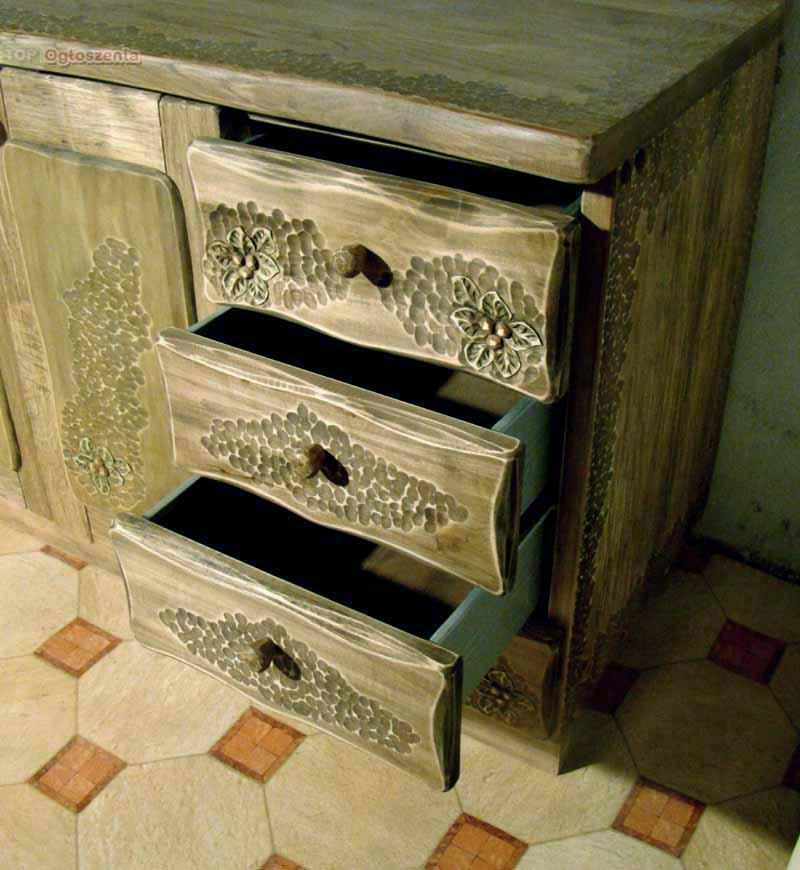 Wykonujemy meble kuchenne, zdobione rzeĽb± - szafki kuchenne stoj±ce i wisz±ce, wykonane z drewna jesionowego, jaworowego lub dębowego (do wyboru), ręcznie rzeĽbione, bejcowane i lakierowane. Blaty robocze wykonujemy z drewna dębowego.
